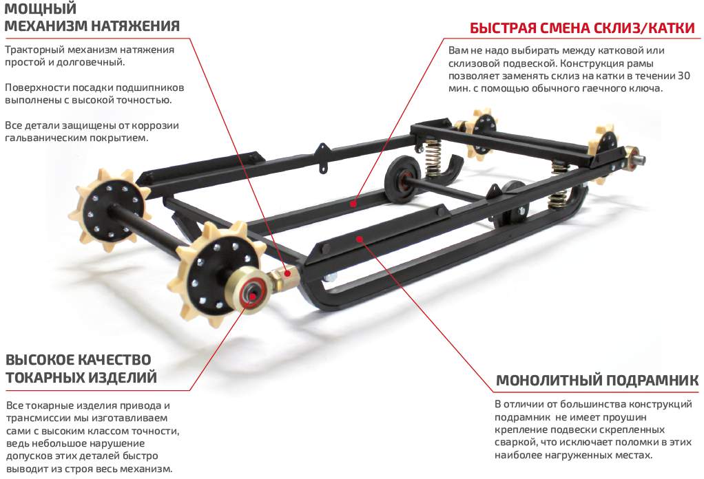 Примечательно, что данная машина способна перевозить до 50 кг груза, а вместе с санями-волокушами этот показатель увеличивается до 400 кг. Высокой грузоподъемности способствует прочная ходовая часть, для укрепления которой использованы простые решения, а не какие-либо прогрессивные и дорогие технологии. В результате получилась крайне простой в эксплуатации и управлении снегоход, справится с которым сможет даже начинающий пользователь, не имеющий водительского удостоверения.